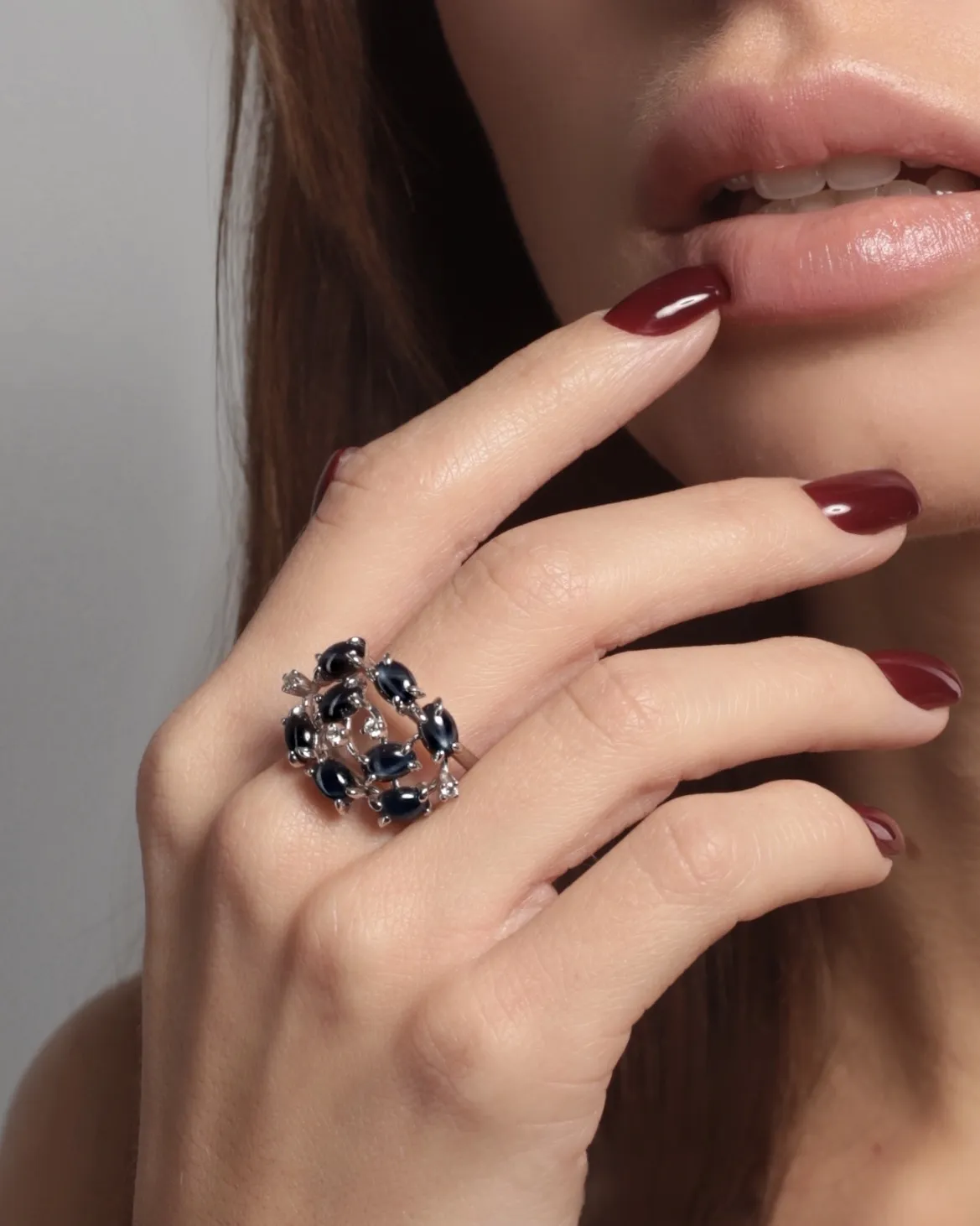Кольцо с бриллиантами и звездчатыми сапфирами